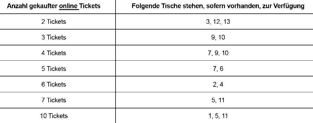 Es kann nur ein kompletter Tisch reserviert werden! Wir reservieren Euch, wenn verfügbar, anhand der gekauften Tickets, den passenden Tisch.